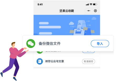 坚果云收藏支持导入微信聊天中的文件至坚果云,无需担心文件过期或被清理,是您节省手机空间,备份重要文件的好帮手。