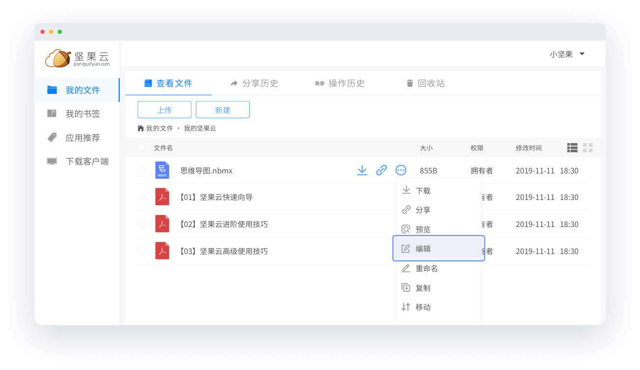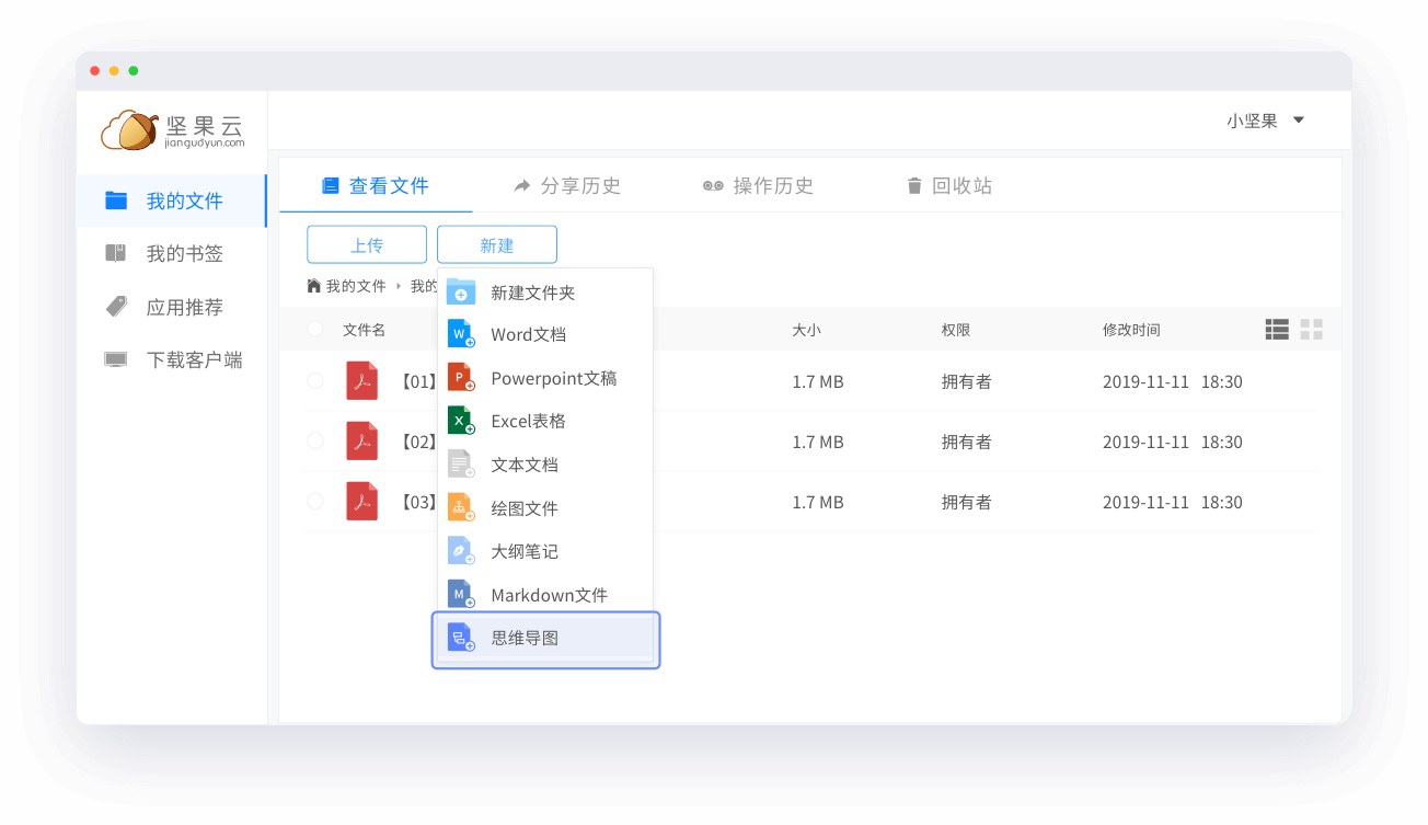 1. 登录坚果云后,进入同步文件夹,点击“新建”,选中“思维导图”新建文件。