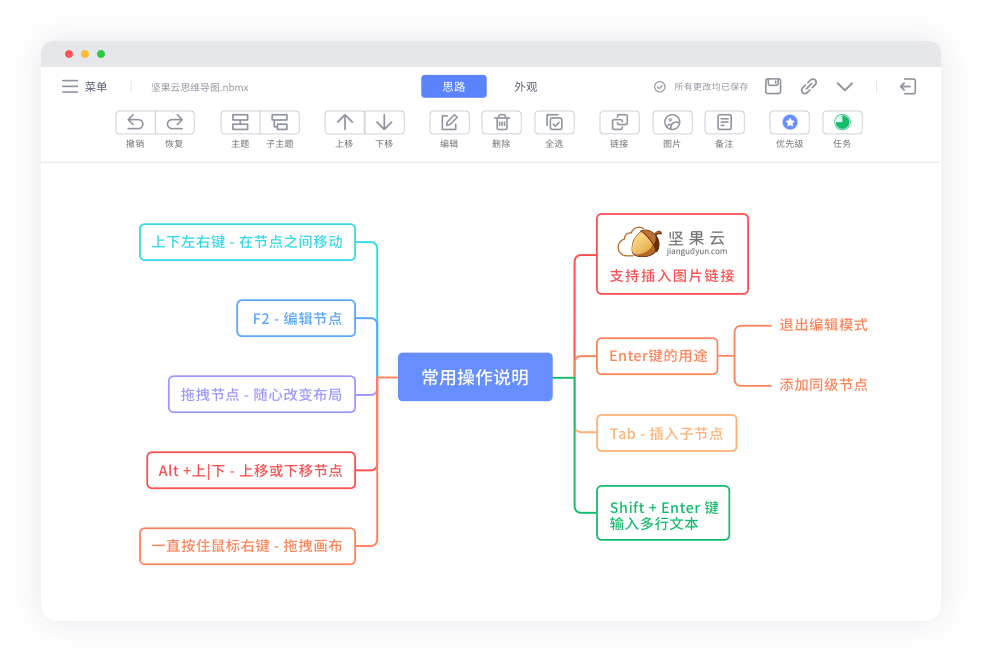 坚果云思维导图采用常规快捷键,无需额外学习,界面简单易懂,轻松上手。