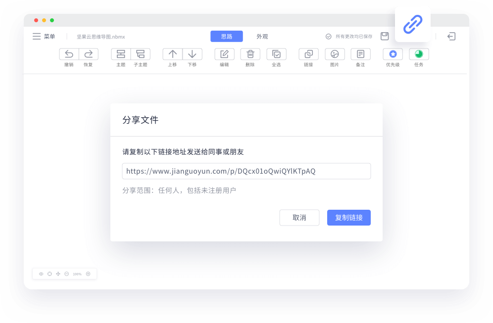 思维导图被加密保存在坚果云中,保障您的资料安全。支持一键分享到微信、QQ等社交软件,方便快捷。